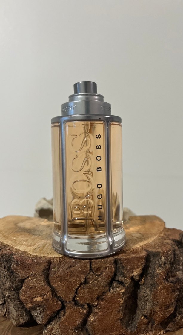 Hugo Boss erkek parfümü, bej renkte ve vintage, karşı kültür tarzında. Şişede gri metal detaylar ve şeffaf tasarım bulunur. 100 ml orjinal kapaksız