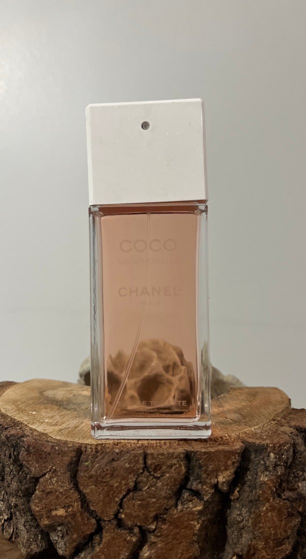 Şeffaf dikdörtgen şişede ve beyaz kapaklı Chanel Coco Mademoiselle kadın parfümü, klasik bir koku sunar.
