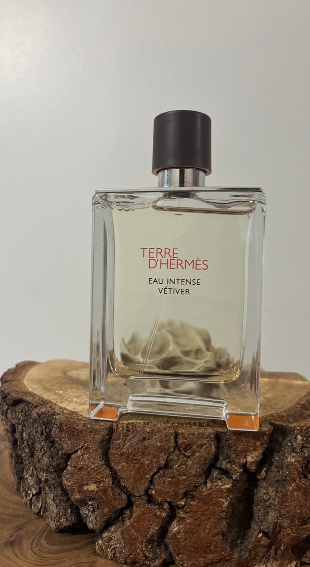 100 ml Hermès Terre d'Hermès Eau Intense Vetiver, gri ve bej renk tonlarıyla Paris tarzı karşı kültür erkek parfümü.