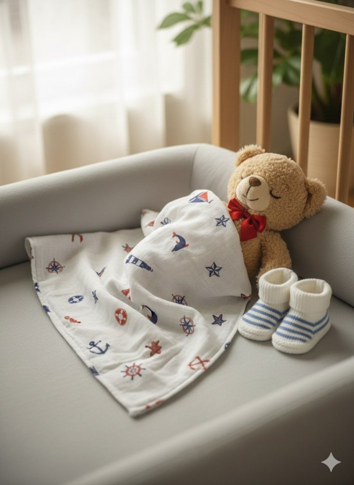 Yumuşak ve sıcak dokuda, renkli nakışlı deniz temalı desenlere sahip beyaz çocuk battaniyesi. ️