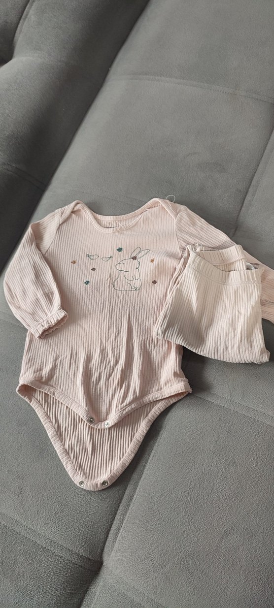 Pastel pembe örgü bebek kız takımı, uzun kollu tulum ve tavşan desenli pantolondan oluşur. Yumuşak ve rahat dokusu ile konfor sağlar. Ürünün kumaşı çok güzel, tiril tiril. Çok şık ve kullanışlı bir ürün. Renginde solma yok, kabarma yok sadece fotoğrafta göruldugu gibi arka tarafında yaka tarafında ufak bir delik olduğu için fiyatı bu kadar çok uygun tuttum