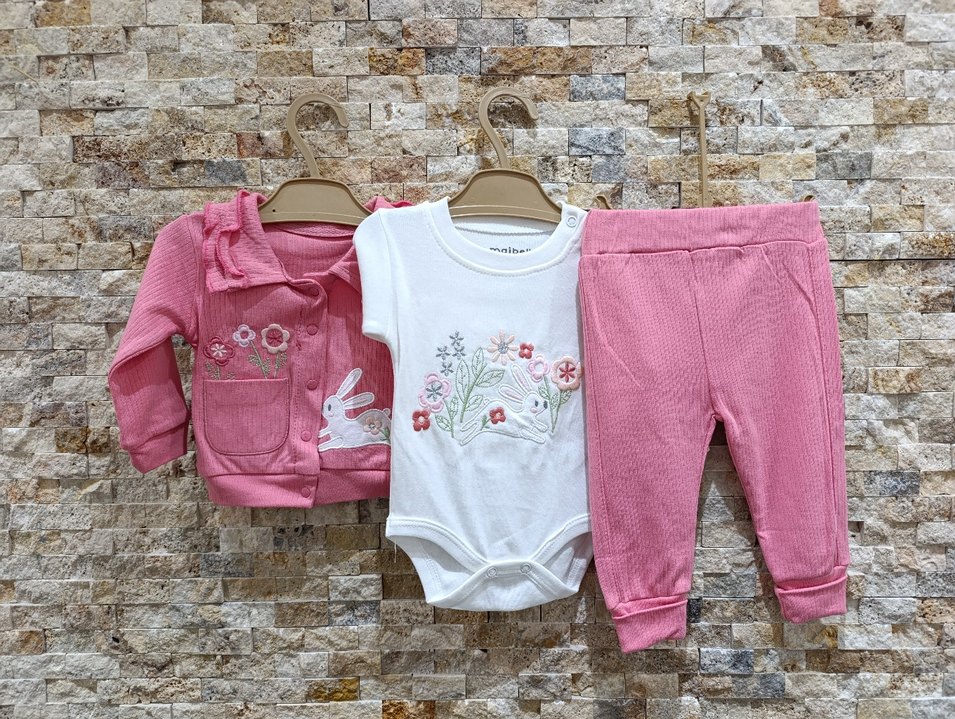 Sıfır, etiketi üzerinde Yumuşacık %100 doğal pamuk kumaş. 0-12 ay arası 4 beden seçeneği mevcut. Ürün 3 parçadan oluşur: Nakış detaylı ceket Tavşan ve çiçek işlemeli kısa kollu badi Rahat penye pantolon Hem şık hem konforlu — hassas bebek cildi için ideal Kız bebekler için mükemmel hediye alternatifi