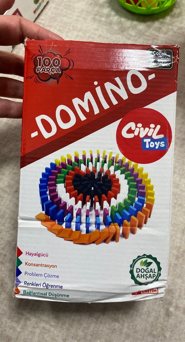 100 parçadan oluşan renkli ahşap domino seti, hayalgücü, konsantrasyon, problem çözme, renkleri öğrenme ve bağlantısal düşünmeyi destekler.