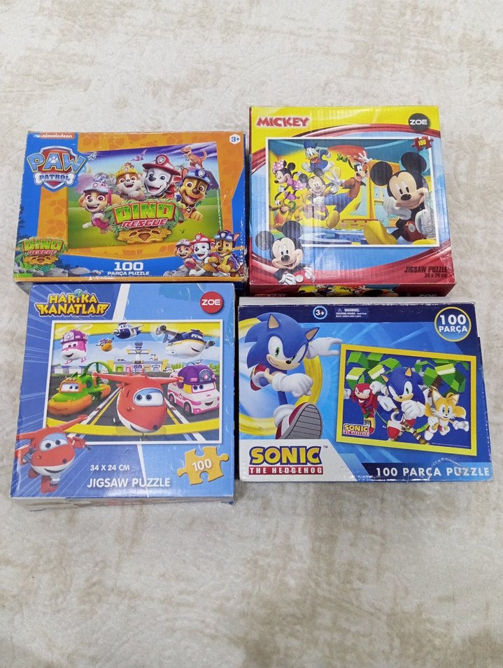 Sonic, Mickey, Paw Patrol ve uçak temalı, her biri 100 parçadan oluşan çocuk puzzle seti. hiçbirinin eksik parçası yoktur. sadece 2-3 tanesinin kutusu deforme olmuş onları da gönderirken bantlarım.