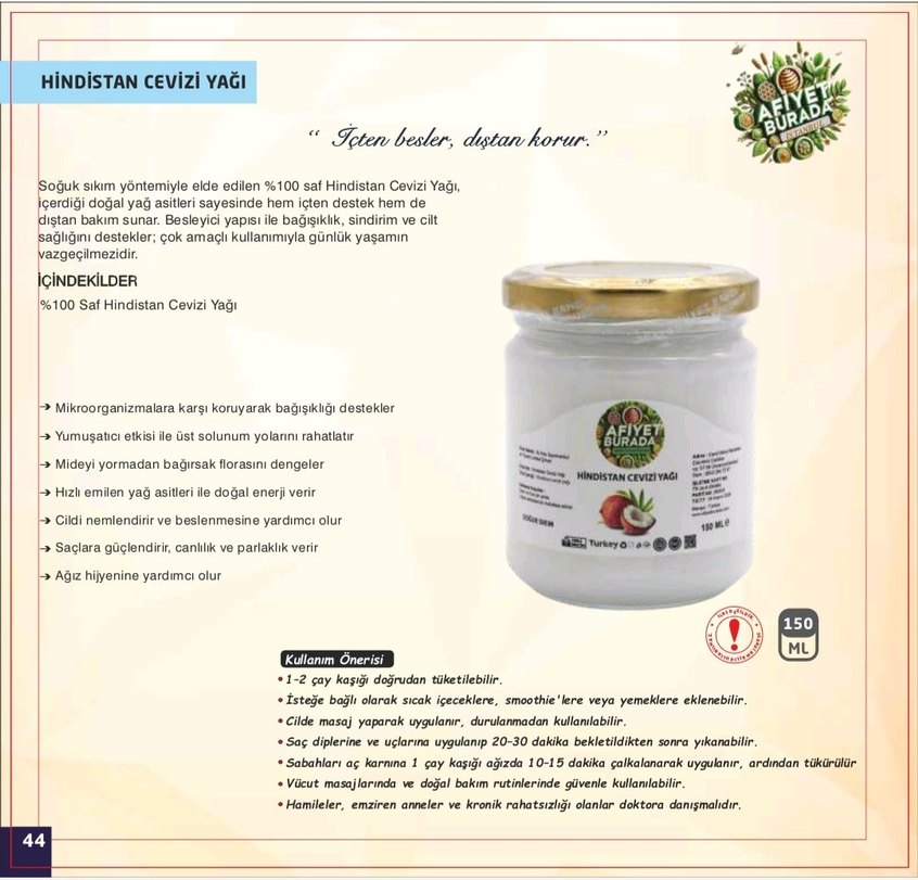 %100 saf Hindistan Cevizi Yağı, bağışıklık ve sindirim sistemini destekler, bağırsak florasını dengeler, solunum yolunu rahatlatır ve cildi besler. Masaj ve günlük bakımda kullanılır.