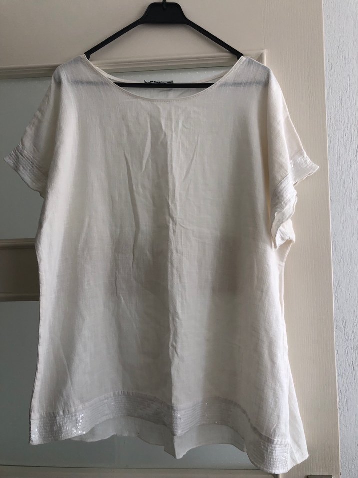 Kolunda ve alt kısmında pul süslemeler var. Beyaz ince keten gibi kumaş kısa kollu, yuvarlak yakalı, salaş ve midi boyda bir bluz. Minimalist ve bohem tarzı yansıtan sade, desensiz tasarıma sahiptir. Alt kısmında küçük bir defo vardır fotoğraflara koyuyorum.