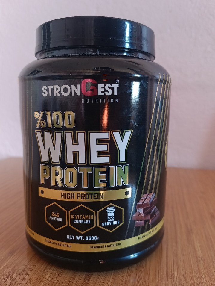 Parlak kahverengi toz, Strongest Nutrition markasına ait 9600g %100 whey protein içerir. Her porsiyonda 24g protein ve B vitamini kompleksi bulunur. 32 porsiyonluk kutu. (çok az kullandım kullanılan miktar fotoğraflar da mevcuttur).