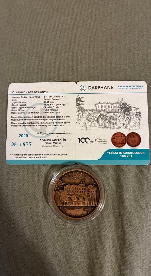 Parlak camel renginde, Yeşilay'ın 100. yılına özel bronz hatıra parası. Darphane onaylı sertifikası ile beraber gelir.