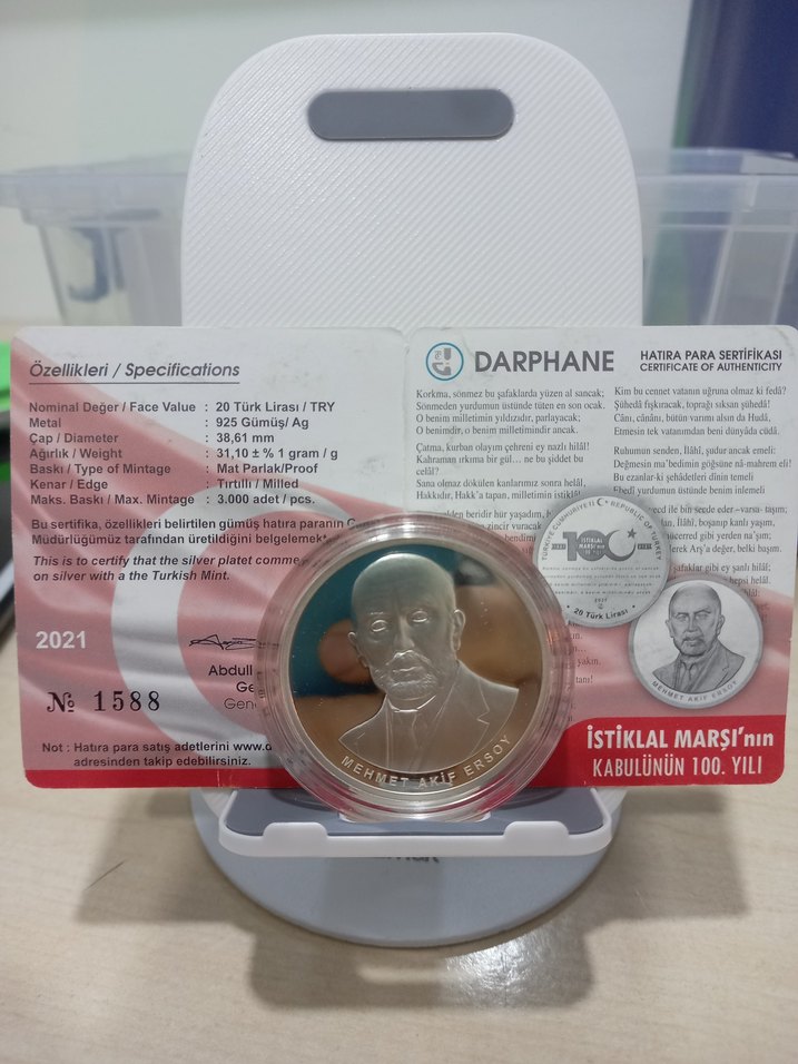 Parlak altından yapılmış bu hatıra parası, İstiklal Marşı'nın kabulünün 100. yılını kutlamaktadır. 20 Türk Lirası nominal değere ve 31,1 gram ağırlığa sahiptir. Darphane sertifikalıdır.