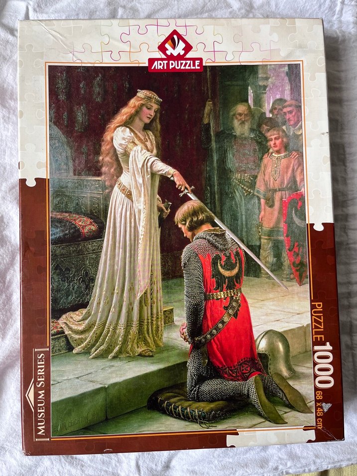 1000 parçadan oluşan ART PUZZLE, koyu bordo renk tonlarında şövalyenin şövalyelik törenini klasik sanat tarzında gösteriyor. Eksik yoktur