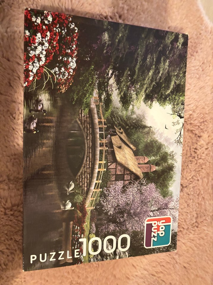 1000 parçadan oluşan bu puzzle, ahşap köprü, kır evi ve renkli çiçeklerle dolu koyu, canlı bir doğa manzarası sunar.