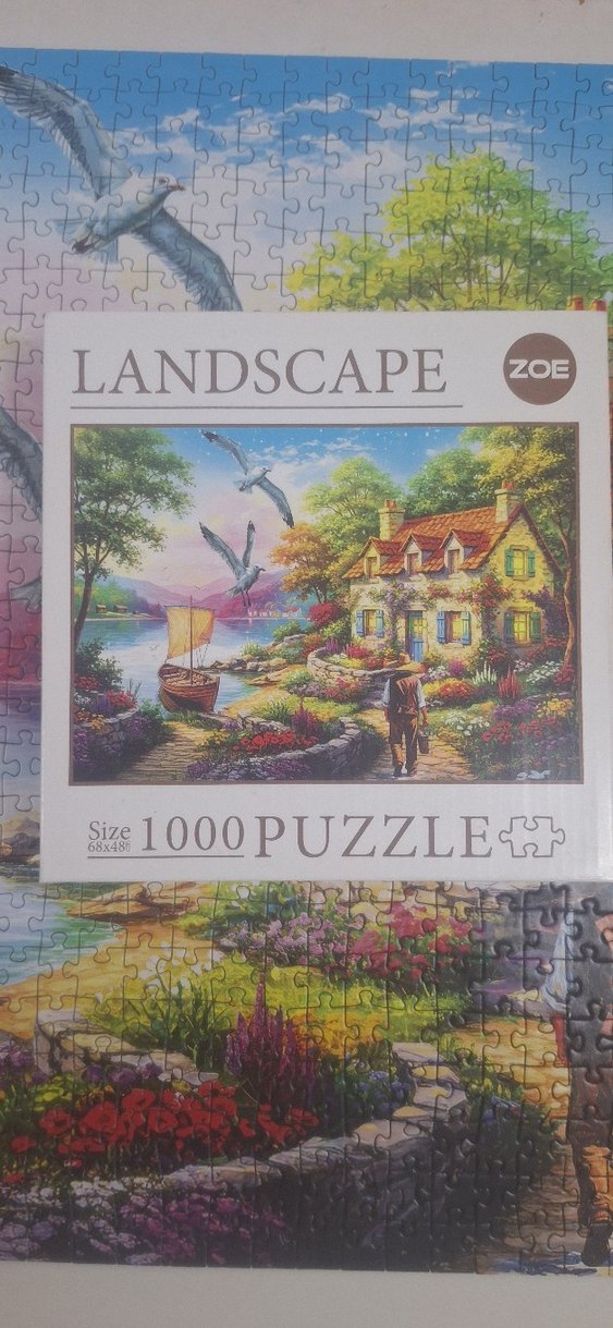 1000 parçadan oluşan bu puzzle, renkli manzara, ev, yelkenli ve kuşları içerir. Detaylı ve canlı bir sahne sunar.