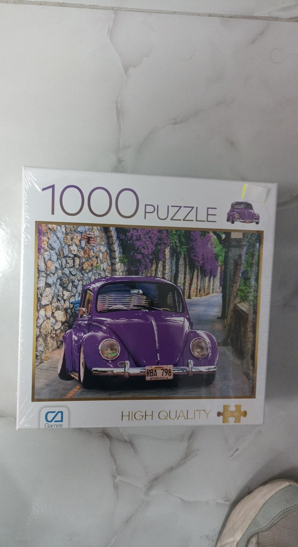 Bu puzzle, taş sokakta koyu mor renkte vintage bir araba tasarımı içerir. 1000 parçadır.