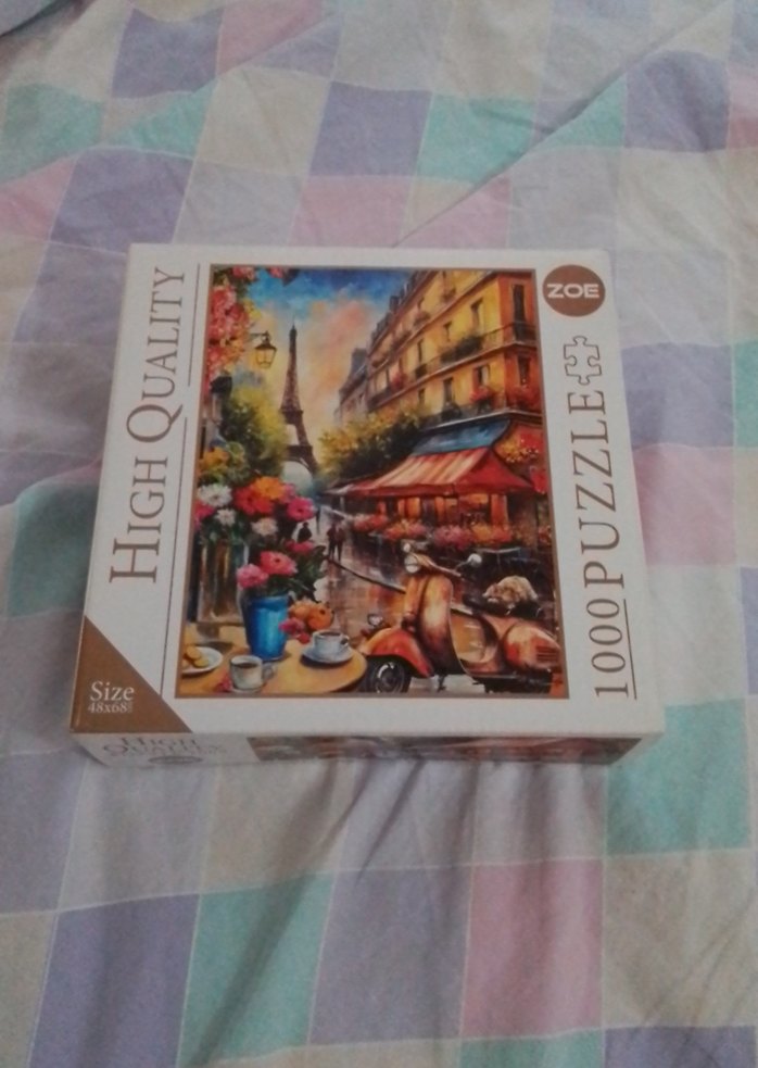 1000 parçalı puzzle, parlak ve çok renkli tasarıma sahip. Eyfel Kulesi manzaralı Paris sokak sahnesi içerir. Yüksek kalite ve boyut belirtilmiştir.