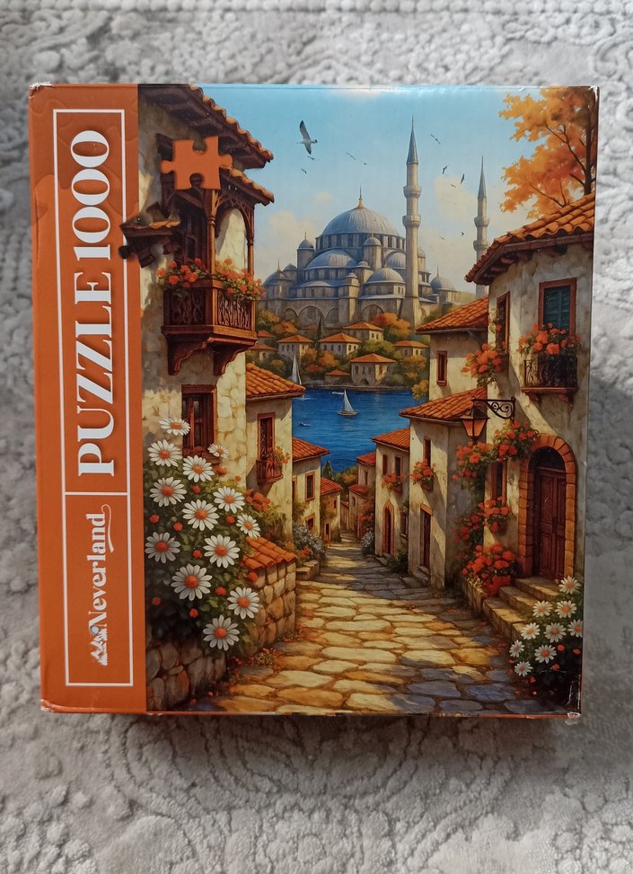 Neverland markalı 1000 parçalı puzzle, tarihi bir kasaba, cami, çiçekler ve nehir detaylarıyla renkli bir sahne sunar.