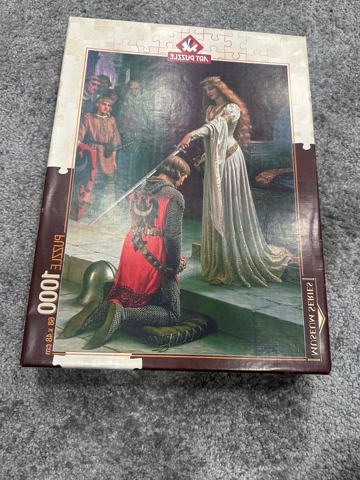 1000 parçadan oluşan, şövalye ve beyaz elbiseli bir hanımefendinin yer aldığı karanlık temalı puzzle. Boyutu 68x48 cm.
