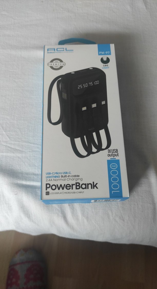 10000 mAh kapasiteli siyah powerbank, 3 USB çıkışı ve USB-C, Micro USB, Lightning kabloları ile birlikte gelir. LCD ekran ve LED ışık bulunur.