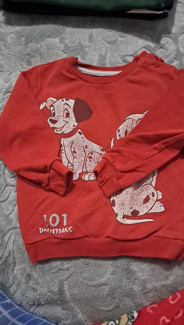 Uzun kollu, bisiklet yaka, bol kesim kırmızı sweatshirt. Renkli 101 Dalmaçyalı baskılı, omuzda düğmeli, yumuşak kumaştan üretilmiştir.