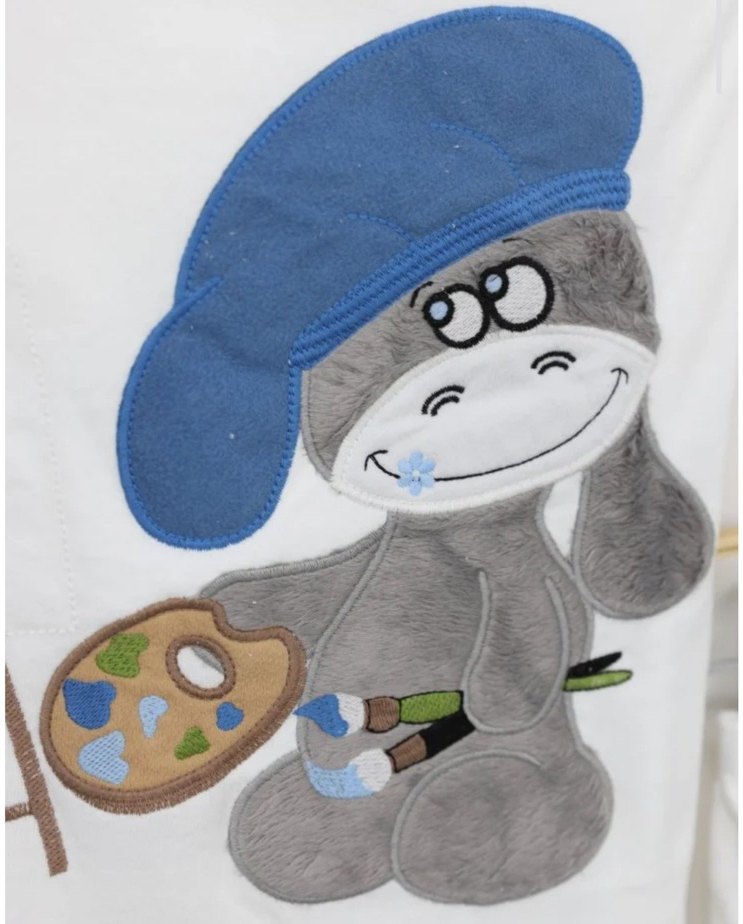 Mavi şapkalı, ressam paleti ve fırçalar tutan yumuşak gri hastahane cikisi. Sevimli ve sanatsal tasarım.