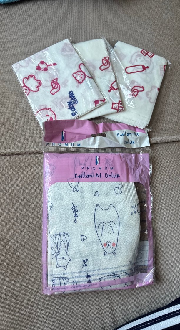Paketler hiç açılmamıştır. 10 adet tek kullanımlık mama örtüsü ve 3 adet tek kullanımlık alt açma örtüsü.