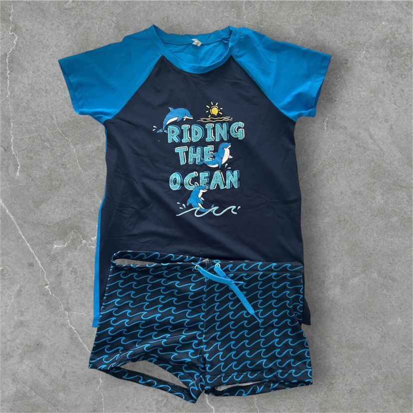 Erkek çocuk için kısa kollu, deniz temalı baskılı üst ve dalga desenli şortlardan oluşan koyu mavi mayo takımı.