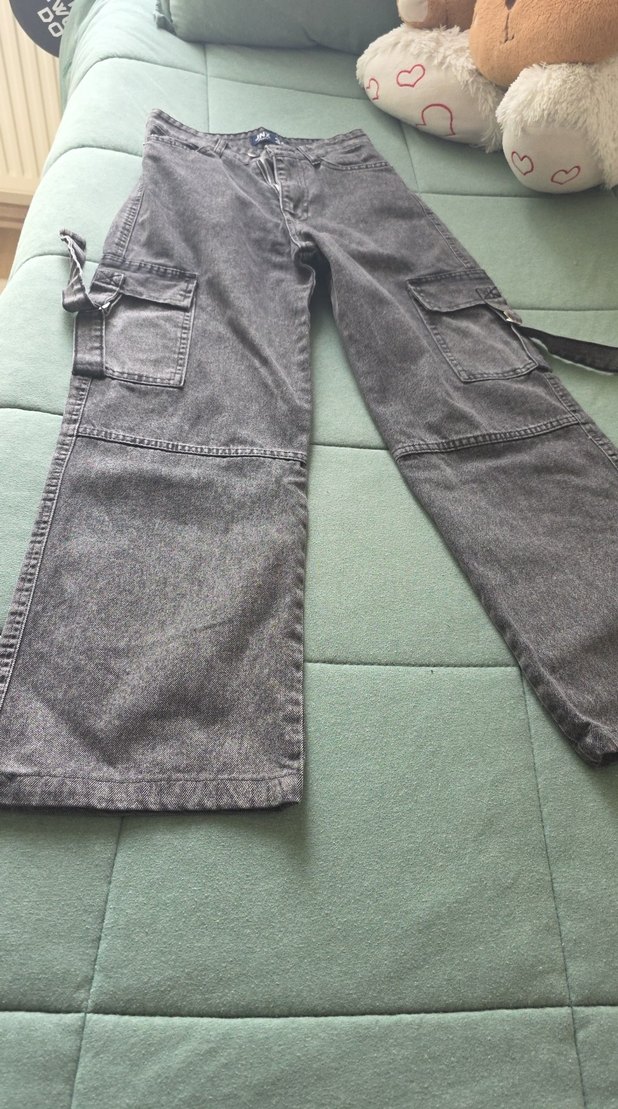 Gri renkli, bol kesim, kemerli kargo cep kiz cocuk kot pantolon. Midi boy ve cep detaylı, sokak stiline uygun rahat bir model. xs giyen
