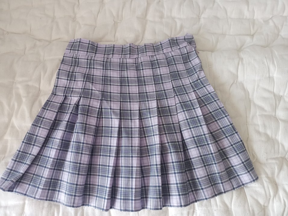Pastel mor renkte, pilili ve ekose desenli rahat kesim mini etek. Yumuşak sentetik kumaştan üretilmiştir. 11/12 yasa uygun.