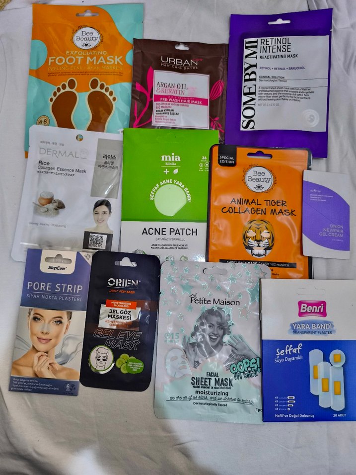 Kadınlar için çeşitli cilt bakım maskeleri ve bantları içeren set; ayak peeling maskesi, kolajen maskesi, akne bandı, gözenek temizleyici ve nemlendirici yaprak maske içerir.