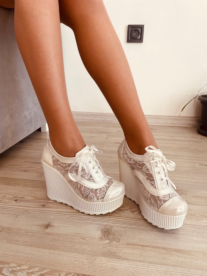 Dantel detaylı beyaz dolgu topuklu ayakkabılar, hafif ve desensiz tasarımıyla şık ve rahat bir görünüm sunar. Paris tarzı ve düğün için uygundur.