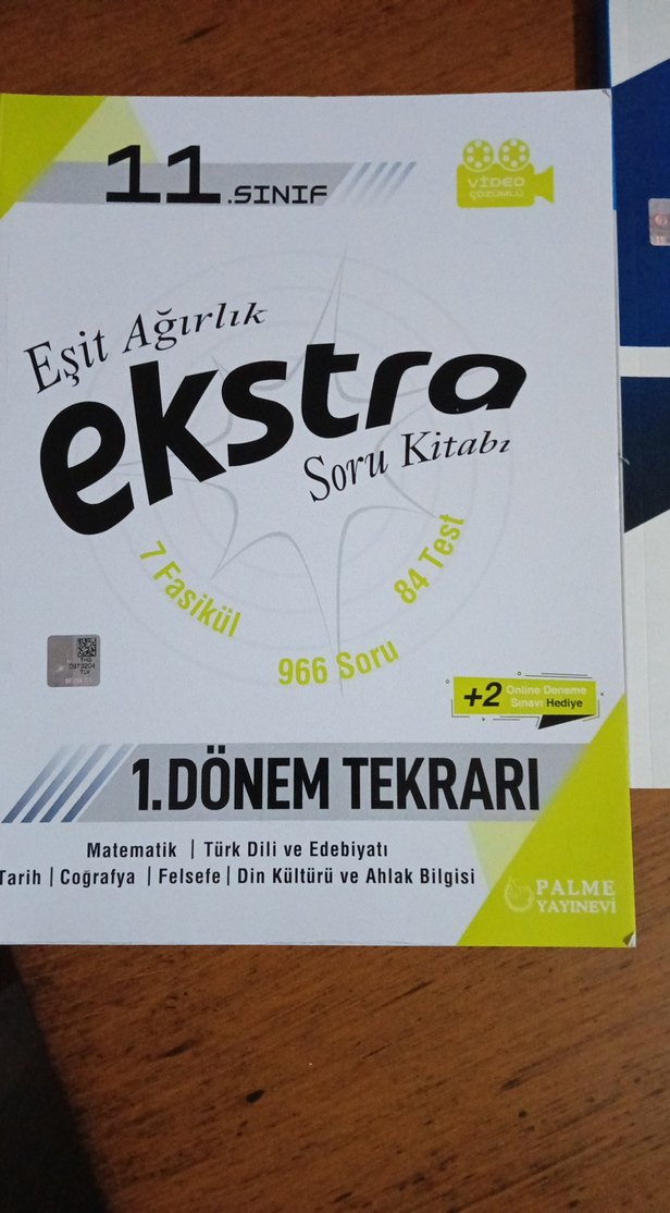 11. sınıf Palme yayınevi eşit ağırlık için 966 soru ve 84 test içeren 1. dönem tekrar kitabı. Matematik, Türk Dili ve Edebiyatı, Tarih, Coğrafya, Felsefe, Din Kültürü ve Ahlak Bilgisi içerir.