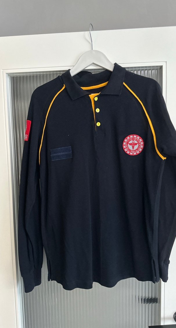 Uzun kollu, yakalı ve düğmeli erkek polo tişörtü. Sarı detaylı ve baskılı rahat kesim, İki kol arası 48 cm boy 65 cm