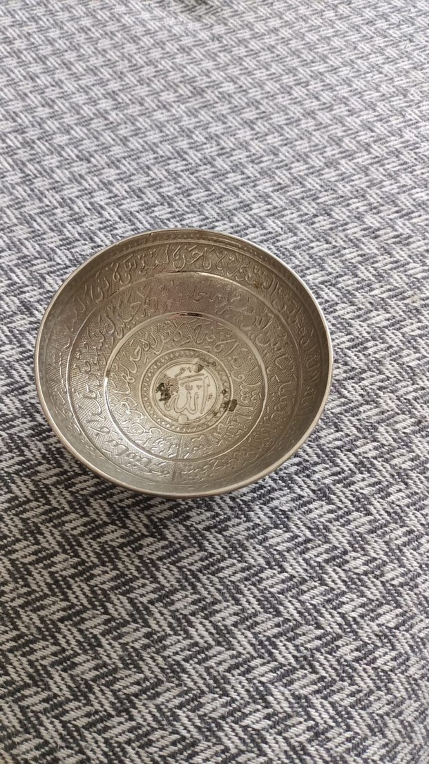 Geleneksel desenlerle işlenmiş, arapça dualı tabak. Yüzeyinde zarif oyma desenler bulunur.