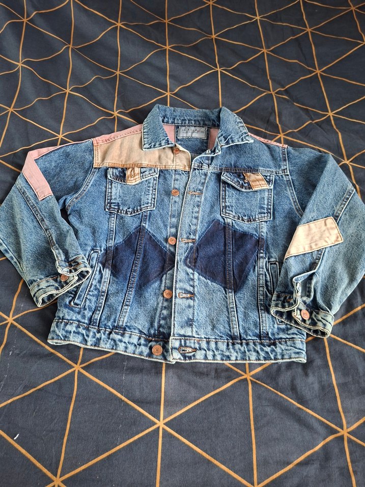 düğmeli, bol kesim ve yakalı mavi kot ceket. Retro ve grunge punk tarzını yansıtan, günlük kullanıma uygun normal uzunlukta bir model.