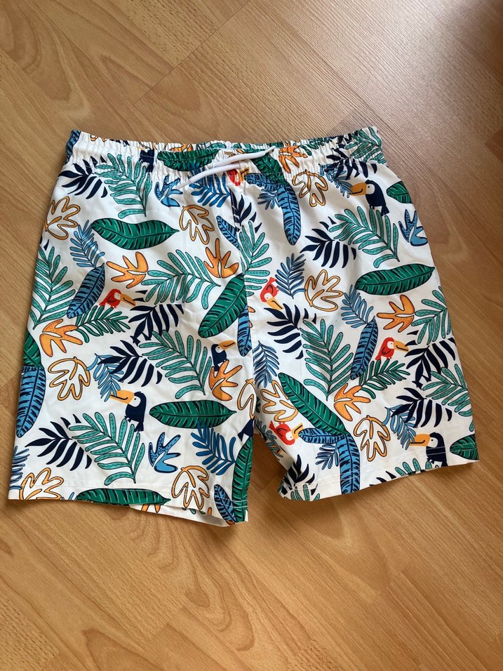 Tropikal yaprak ve kuş desenli, rahat lastikli bel bantlı çok renkli erkek çocuk mayo şortu. Geçen sene aldık. 1-2 kez giyildi ve bu sene olmuyor. Yepyeni, tertemiz