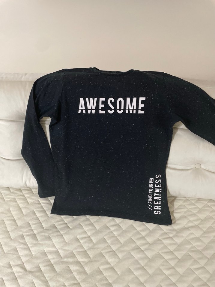 12-13 yaş için denim sweatshirt, uzun kollu ve yuvarlak yakalıdır. Bol kesimi rahatlık sağlar. Önünde 'AWESOME', yanında 'FIND YOUR GREATNESS' baskıları bulunur. Sokak stili ve rock punk havası taşır. İki koltuk arası 47 cm ,boy 62 cm dir.✨