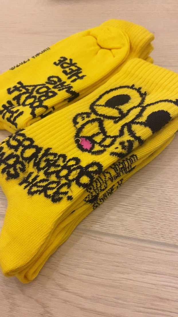 Rahat kesim, midi boyda sarı çoraplar, renkli baskılı karikatür ve yazı detaylarıyla. Günlük kullanıma uygun konforlu ve rahat tarz.