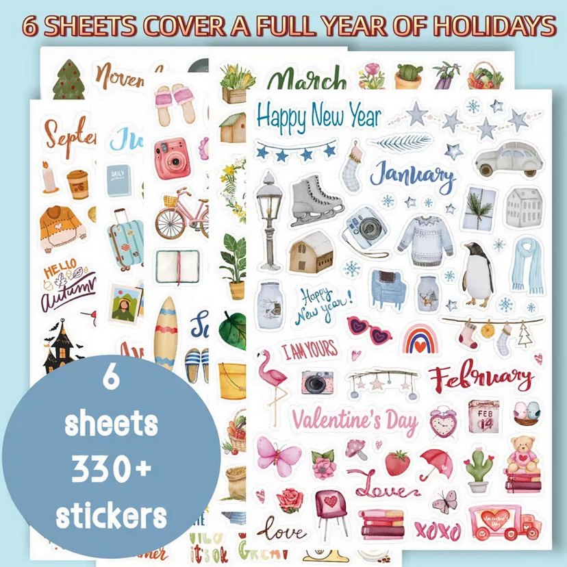 Planner, ajanda, bullet journal ve defter süslemeyi sevenler için tam yıl temalı sticker seti ✨ İçerik: Toplam 6 yaprak 330+ adet sticker Ocak–Aralık tüm aylar Sevgililer Günü, Anneler Günü, Babalar Günü, yılbaşı, sonbahar, yaz tatili, okul temaları Stil: Pastel & watercolor çizimler Mevsimlere ve özel günlere uygun illüstrasyonlar Ajanda, planner, defter, scrapbooking için ideal