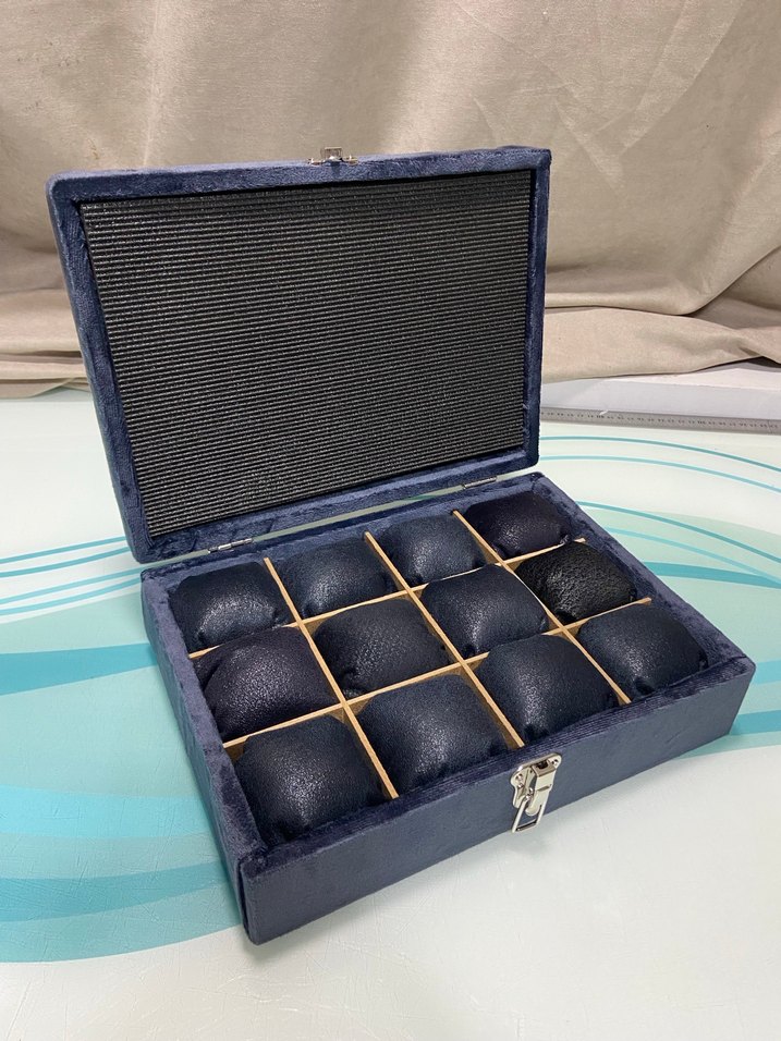 12 bölmeli, yastıklı saatlik koymak için koyu mavi dolap düzenleyici. Dayanıklı kilit ve yumuşak kumaş kaplama bulunur. ⌚