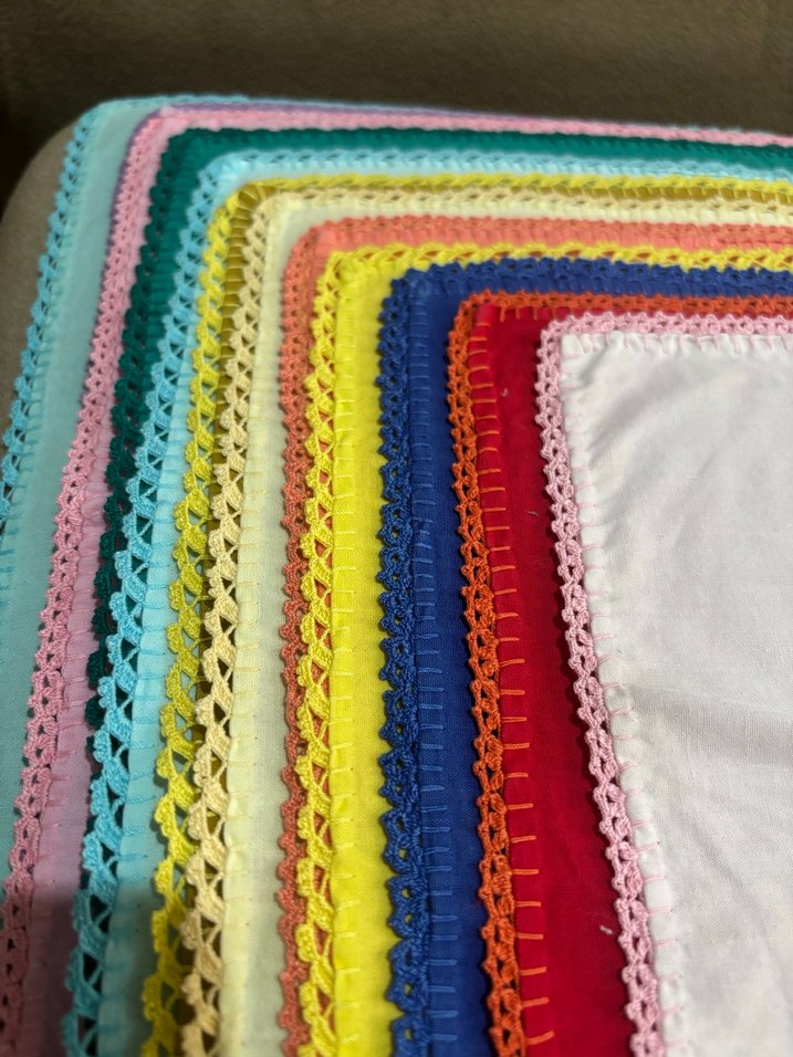 Dantel kenarlı, pamuk malzemeden yapılmış renkli kadın peçete, vintage ve bohem tarzda. El boyama çanta ile gönderilecektir. Kullanılmış üründür. Peçete boyutlarında +-1 cm fark olabilmektedir.