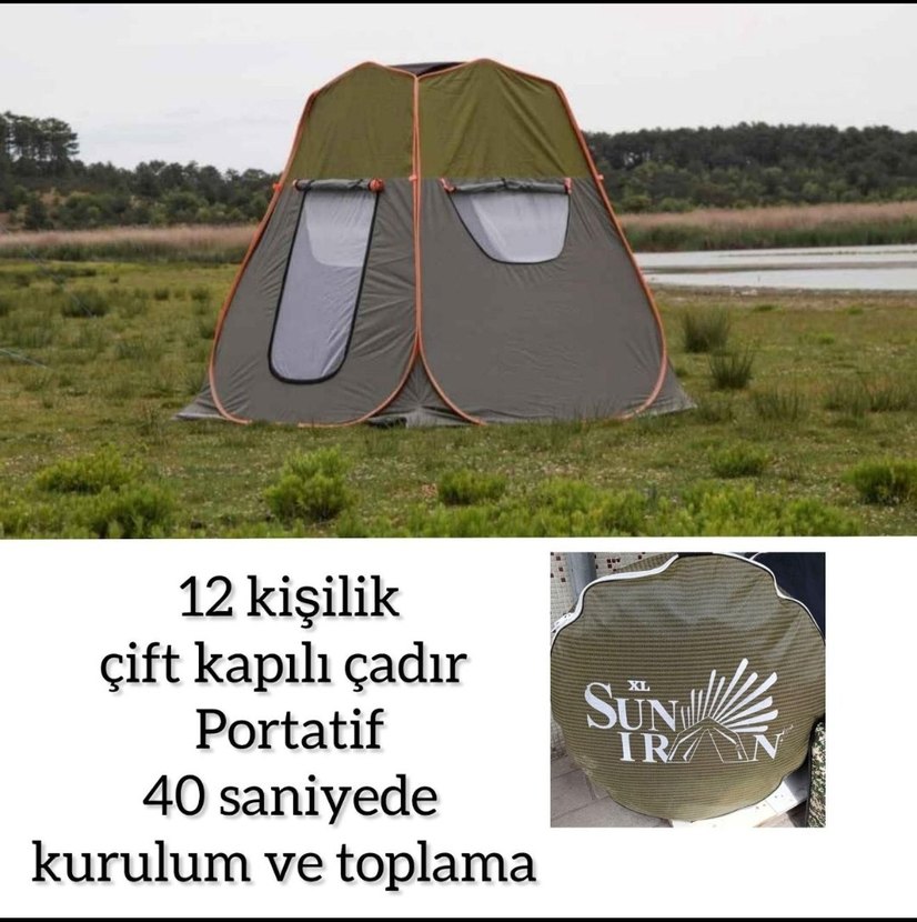 12 kişilik, çift kapılı, portatif ve 40 saniyede kurulup toplanabilen haki renkli çadır. Kolay kullanım sağlar. ⛺