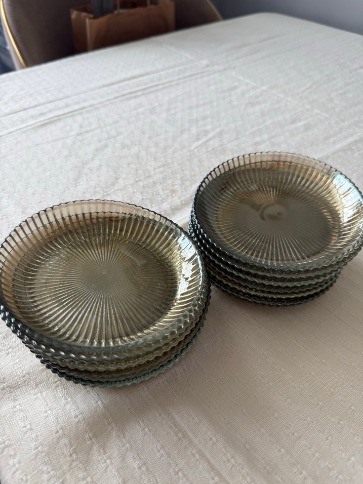 Vintage tarzı, bej ve gri renklerde, kabartmalı cam tabak seti. Çerezlik klasik bir hava katar.