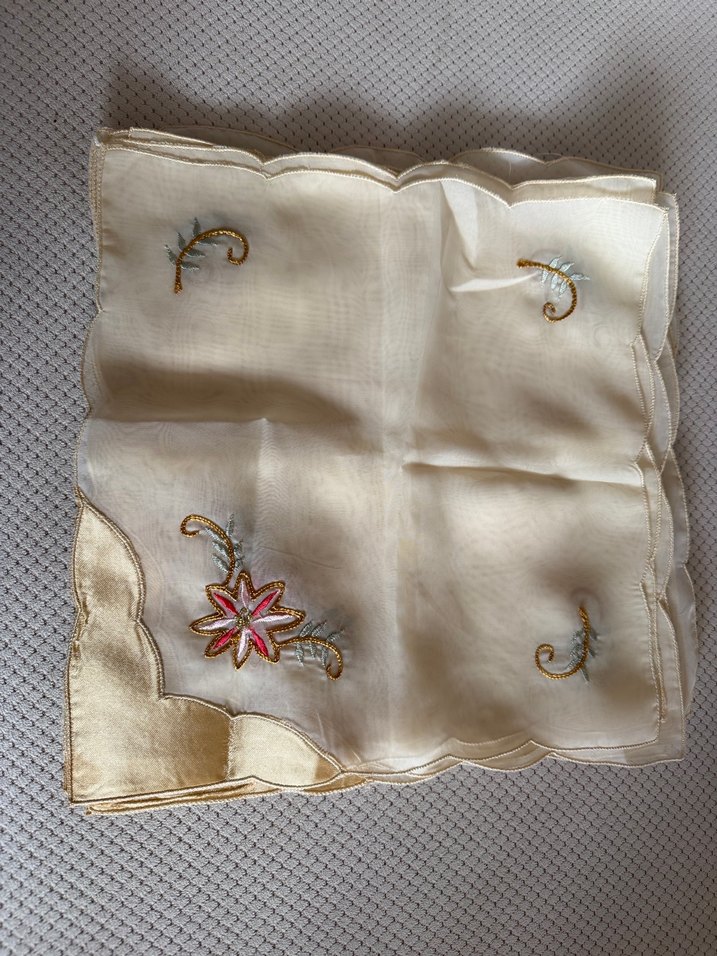 Nakışlı çiçek desenlerine ve kıvrımlı kenarlara sahip, açık beyaz masa örtüsü, geleneksel tarzda.