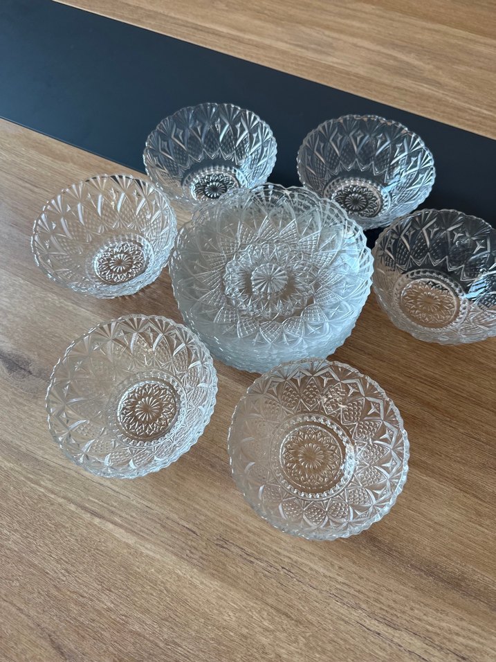 Detaylı desenlere sahip, küçük porsiyonlar için uygun şeffaf cam kaseler seti. Hafif şeffaf görünüm ve dokulu yüzeylere sahiptir…