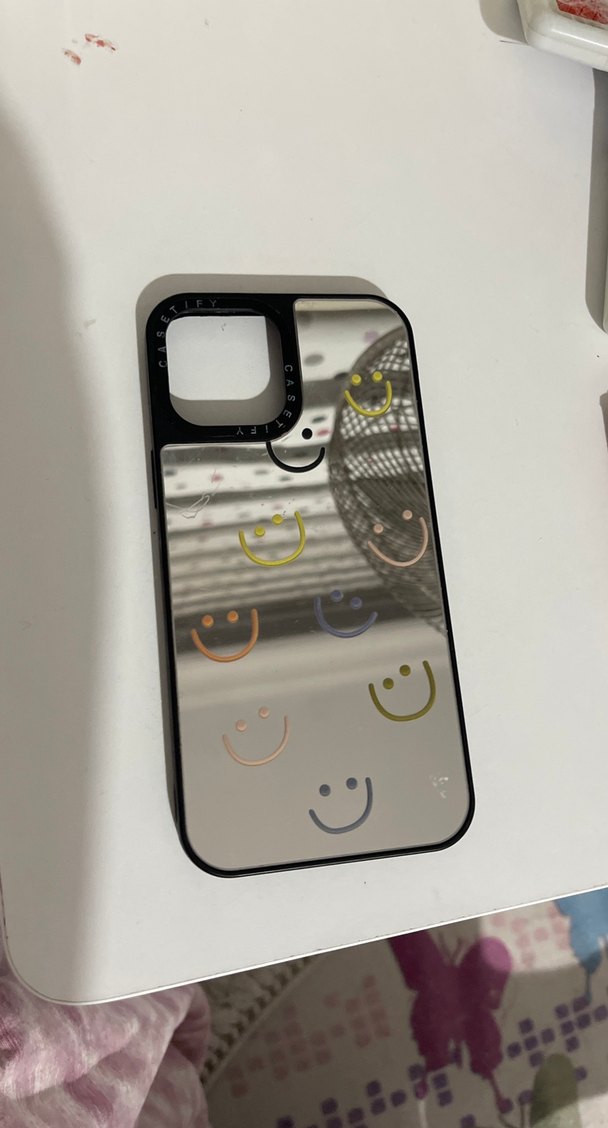Parlak yüzeye sahip, çok renkli gülen yüz desenleriyle pop kültür tarzında, koyu kenarlıklı telefon kılıfı.