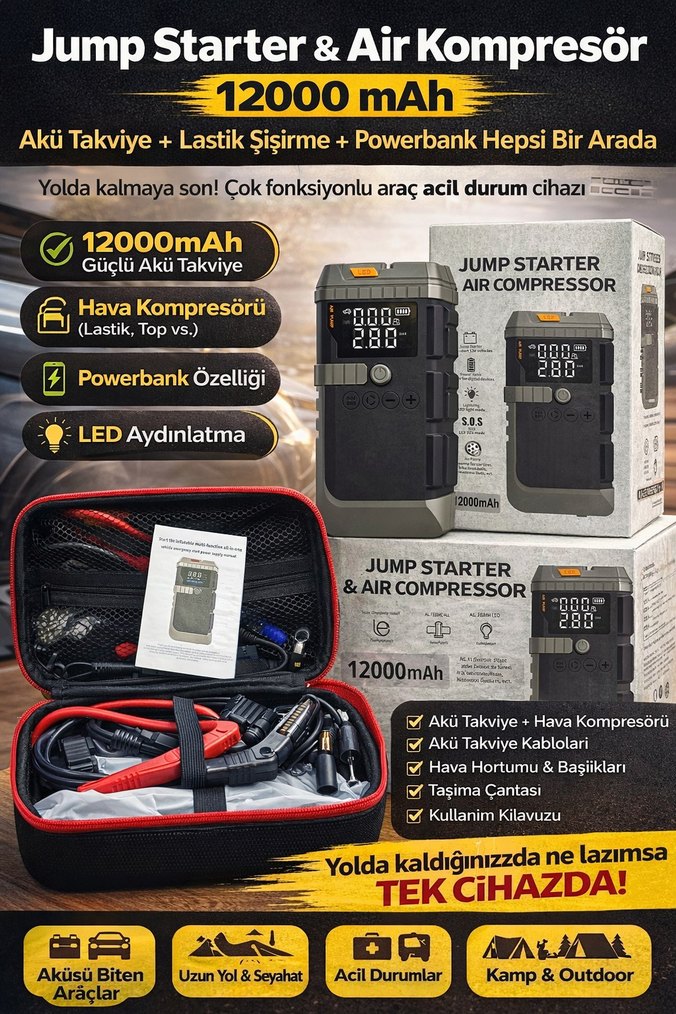12000mAh güçte powerbank, akü takviye ve hava kompresörü özellikleri bir arada. LED ışık, akü kabloları, hava hortumu ve taşıma çantası ile araç acil durumlarında kullanılır.