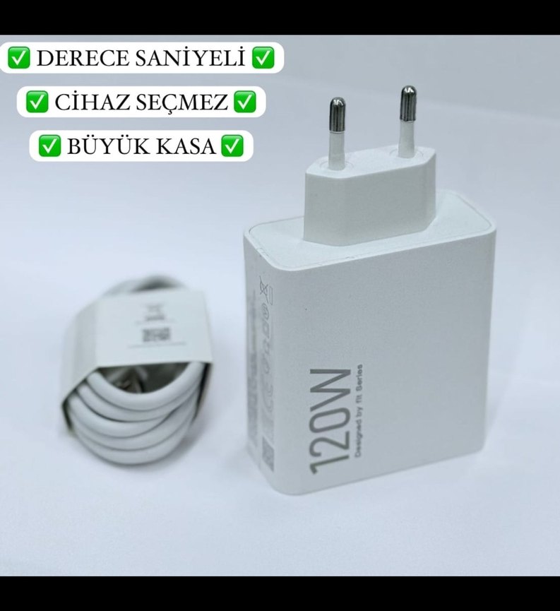 120W gücünde, büyük kasalı beyaz telefon şarj cihazı. 1 saniyede hızlı şarj sağlar ve cihaz seçmez. ⚡