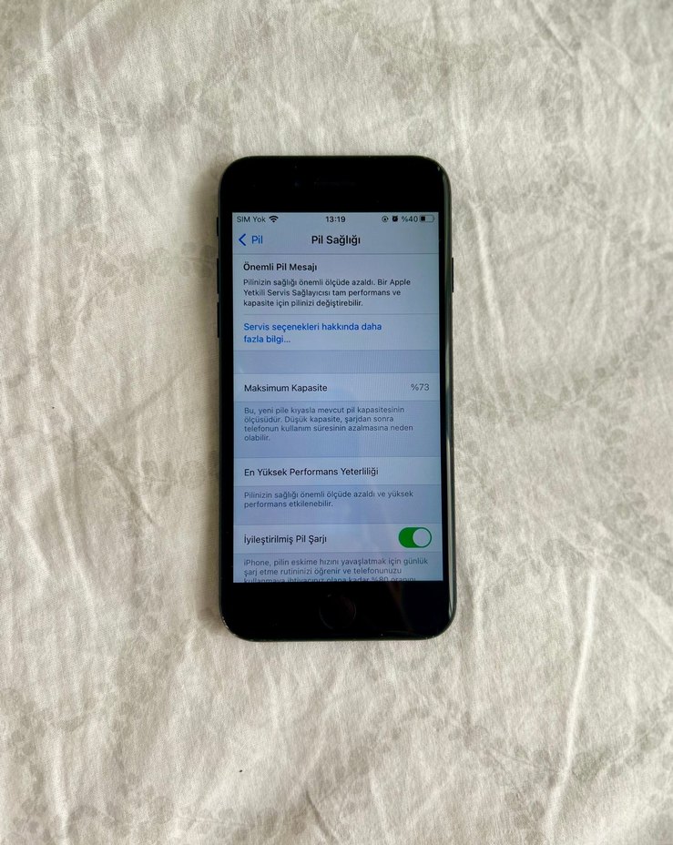 Ekranda pil sağlığı bilgilerini gösteriyor. Bir kere bataryası değişti. Cihazın ön yüzü temiz, parmak izi çalışıyor. Kutu fatura mevcut.