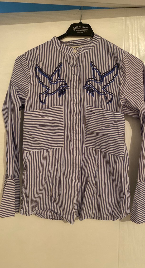Nakışlı, düğmeli uzun kollu mavi gömlek, normal kesim ve yakalı. Günlük kullanıma uygun. ️