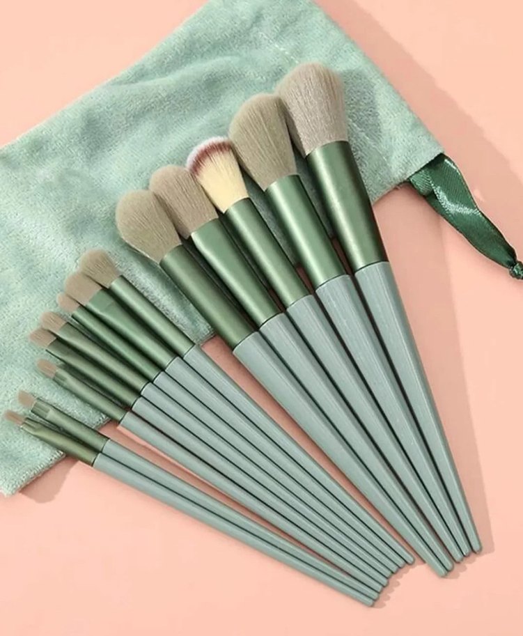 Yumuşak kıllara sahip, farklı boyutlarda pastel renkli khaki makyaj fırçası seti. Uyumlu saklama çantasıyla birlikte.