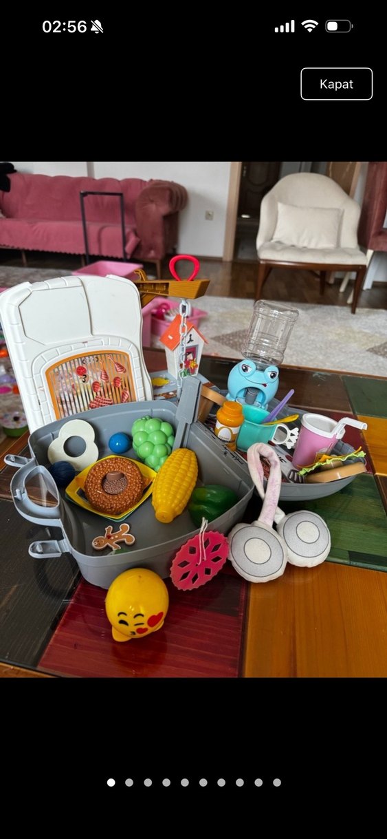Çeşitli oyun yiyecekleri ve aksesuarları içeren renkli çocuk oyun seti, hayal gücünü destekler. Meyve, sebze ve mutfak gereçleri gibi parçalar bulunur.